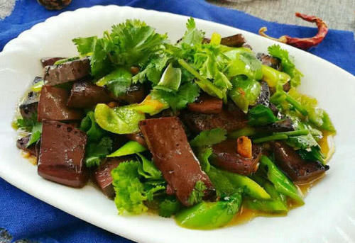 材料:猪血1块,青椒适量,盐和料酒少许,蒜末适量